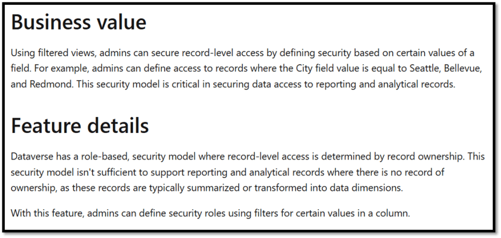 This new feature is a welcome addition to how we can utilise security roles. With this, you’ll be able to define security using a value within a field in your table. For instance, user can only access records where the City = London. – I think this will be really useful for making it easier to ensure users can only see records which they have the business need for and I can see this being used A LOT. Interestingly, this is only set for preview with no planned GA date at this stage.